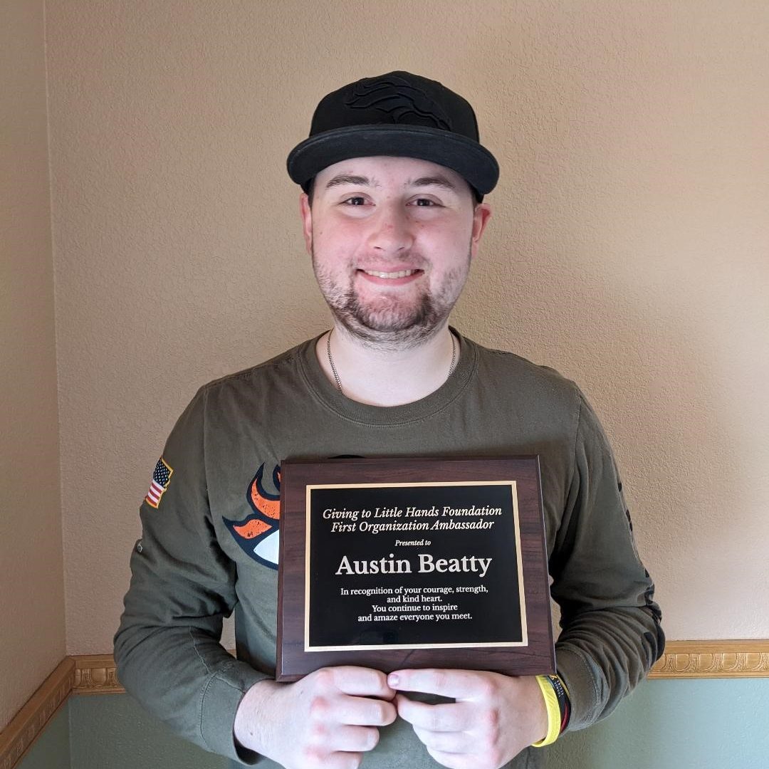 “Hello, my name is Austin Beatty. I’m 20 years old. I first met this wonderful group of people when I was diagnosed with Osteosarcoma, which is a type of bone cancer. I’ve been battling this cancer for the past 3 years. These wonderful people supported my family in my time of need by giving presents to me and my little sister on Christmas when I was in the hospital. I will always be thankful to them for doing that for my family. Since then they have become the Giving to Little Hands Foundation and I’m honored to be their first ambassador. This incredible foundation is going to help so many families who are battling illnesses. With the support of this Foundation it allowed me to find happiness in a dark time of my life. I’m excited for all of the kids who will be touched by this exceptional group of people.” – Austin Beatty